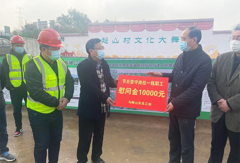 慰問(wèn)現(xiàn)場(chǎng),楊義勇一行詳細(xì)了解我項(xiàng)目現(xiàn)場(chǎng)環(huán)境以及員工當(dāng)前工作與生活中所遇困難等,叮囑大家繼續(xù)堅(jiān)守崗位,做好本職工作的同時(shí),要注意勞逸結(jié)合,積極做好個(gè)人防護(hù)工作,并為廣大留守一線的員工們發(fā)放了慰問(wèn)金。在聽取了項(xiàng)目經(jīng)理王森對(duì)工程基本情況及施工生產(chǎn)進(jìn)度匯報(bào)后表示,安徽交建是一個(gè)朝氣蓬勃且業(yè)績(jī)突出的優(yōu)秀建筑施工企業(yè),從幾年前的馬鞍山長(zhǎng)江大橋引索橋項(xiàng)目到現(xiàn)在的寧蕪改擴(kuò)建黃梅山保通線項(xiàng)目,一直表現(xiàn)優(yōu)秀,并對(duì)安徽交建的管理團(tuán)隊(duì),施工質(zhì)量給予高度認(rèn)可,希望安徽交建踴躍投身馬鞍山建設(shè),以優(yōu)異的施工技藝再創(chuàng)新高。
