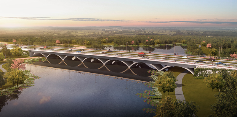 黃河路以“穿透共融、自然綠苑”為設(shè)計理念,融入自然與城市的生態(tài)廊道、見水見林不見路的景觀綠道。道路兩旁兩側(cè)栽植800多棵高桿櫻花樹,花期在每年3月中旬,觀賞期為15天左右,屆時將成為名副其實的“櫻花大道”。同時工程包含一座187米的七跨連拱橋,橫跨錦繡東湖,造型優(yōu)美,輕盈靈動。